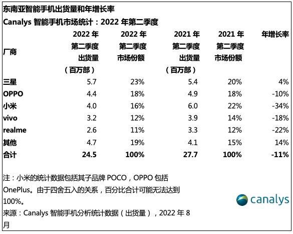小米第二季度出货量为 400 万台,与上季度相等,位居第三位。在五大东南亚商场中,四个商场完成微弱的持续添加,首要得益于新推出的红米 10 系列和之前的红米 9 系列。小米推出的 POCO F4 系列首要依托线上出售,这一子品牌为小米发明杰出的口碑效应,进一步进步其线上出货量。