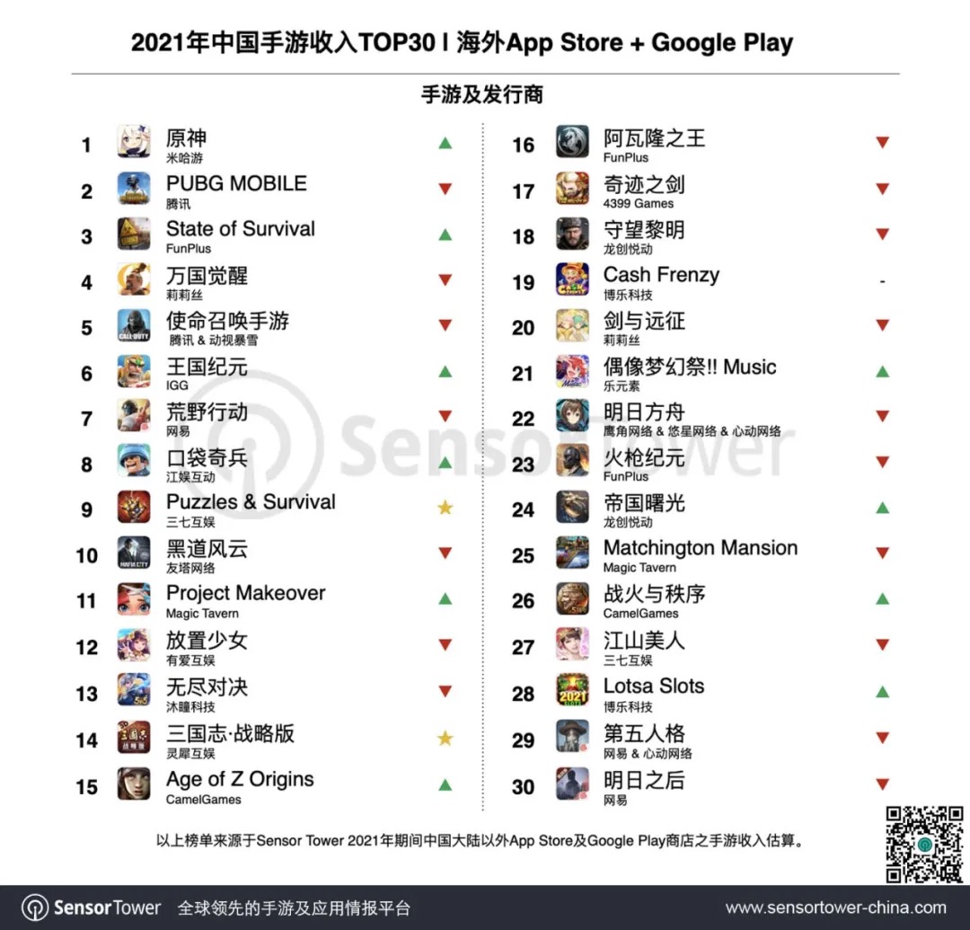 2021年出海收入Top 30榜单