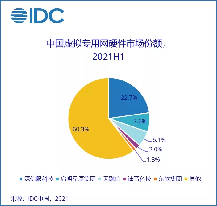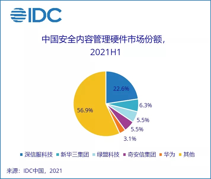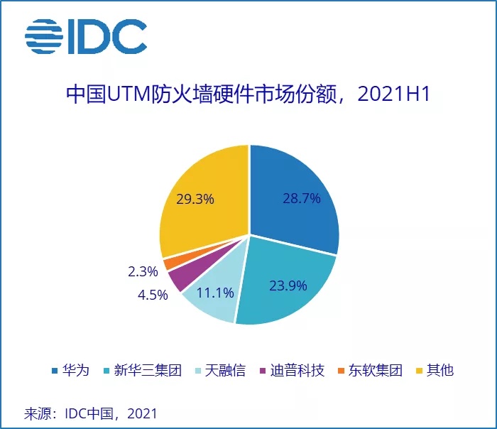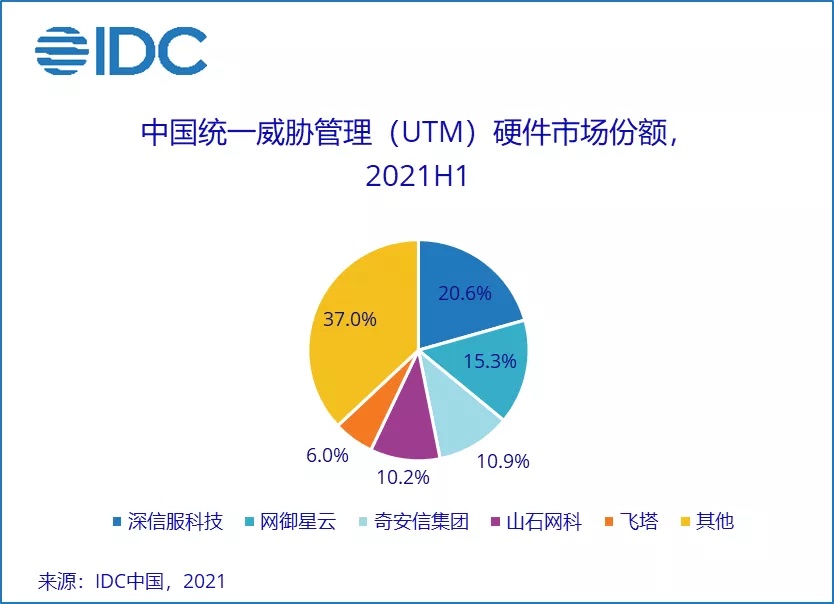 2021年,在国家经济快速康复的大布景下,网络安全商场进入全面回暖期,很多因为疫情而积压的商场需求以及方针推进下的新增商场需求开端迸发,网络安全硬件、软件和服务商场均迎来了更大的时机。聚集网络安全硬件商场:IDC界说下的网络安全硬件商场分别由根据UTM渠道的防火墙(UTM Firewall)、一致要挟办理(UTM)、安全内容办理(SCM)、侵略检测与防护(IDP)、虚拟专用网(VPN)、传统防火墙(Traditional Firewall)构成。2021上半年我国网络安全硬件商场的要害厂商体现如下(因为传统防火墙商场规划现在在不断减缩,故下图无传统防火墙要害厂商相关内容;另,因为数字四舍五入的原因,数字或许存在细小差错):